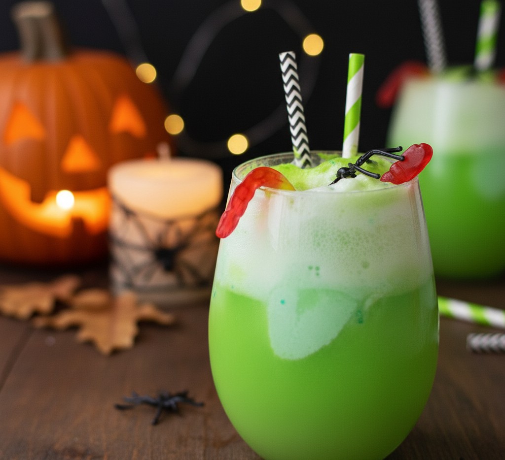 Într-un bol mare torni 2 litri de lemon-lime soda și adaugi câteva picături de colorant verde. Apoi pui cu lingura scoops de rainbow sherbet, care se topesc încet și formează un strat cremos, plin de spumă. Ca să fie complet în ton cu seara, arunci câțiva viermișori din jeleu direct în bol sau îi așezi pe margini.